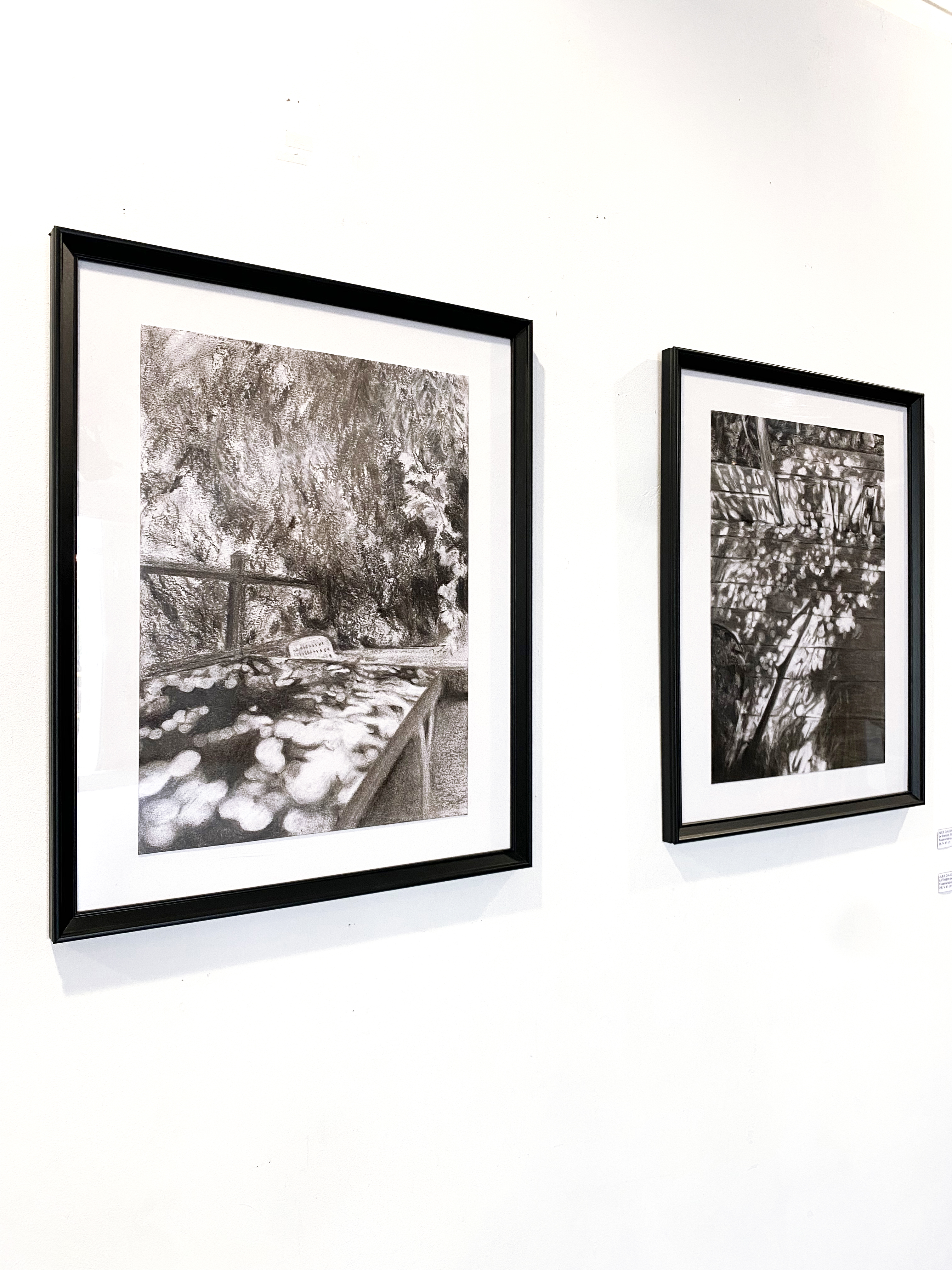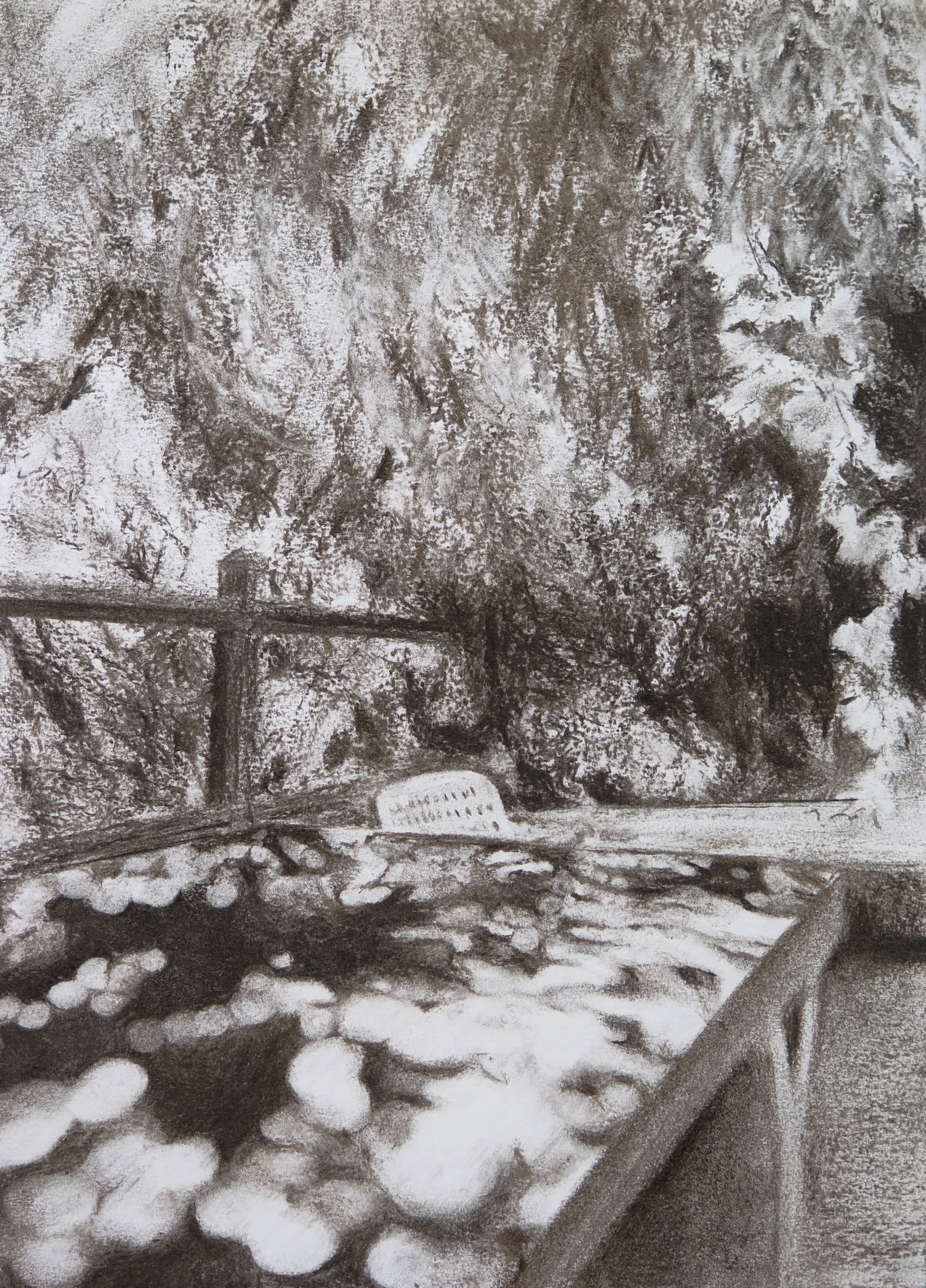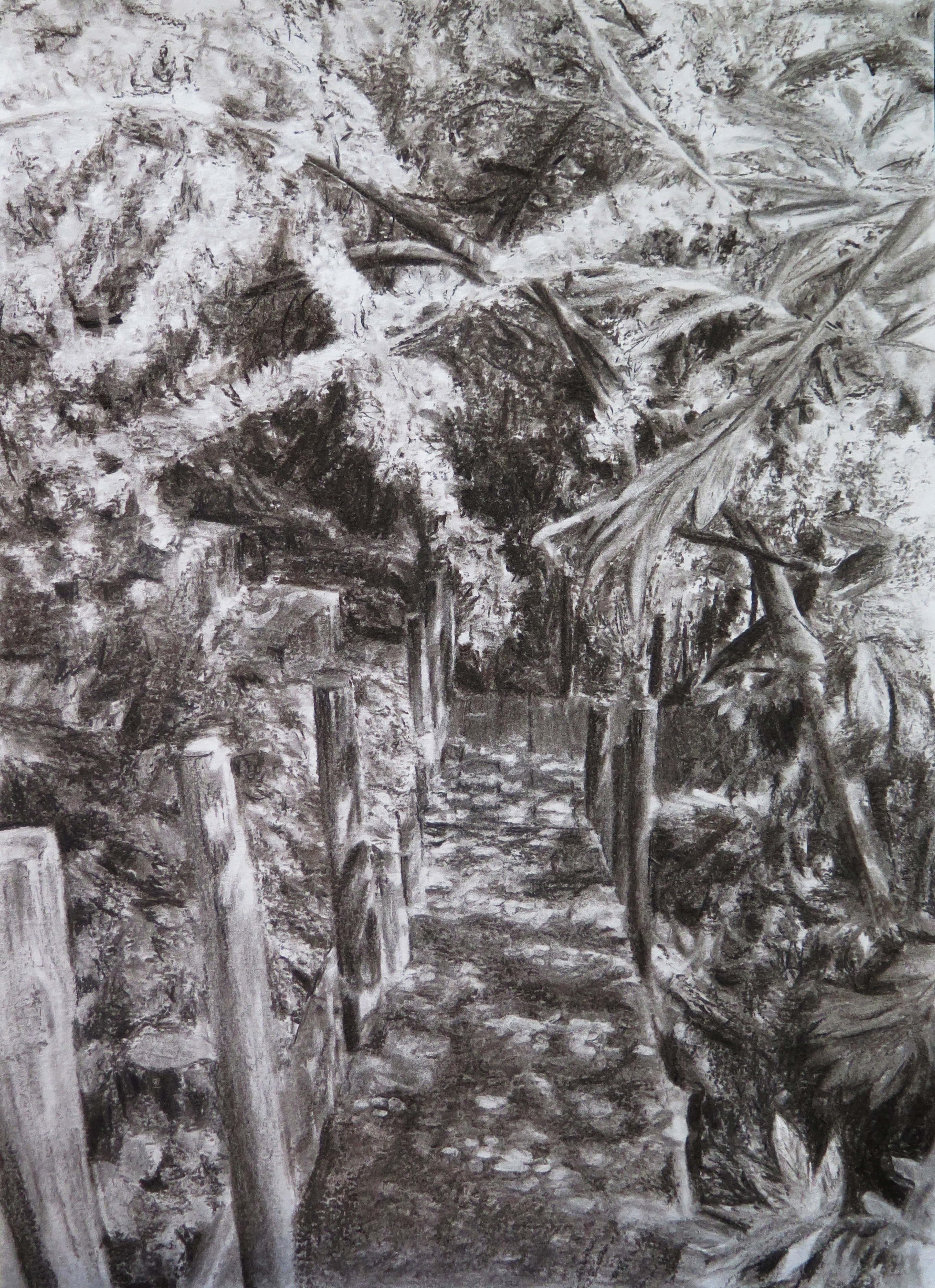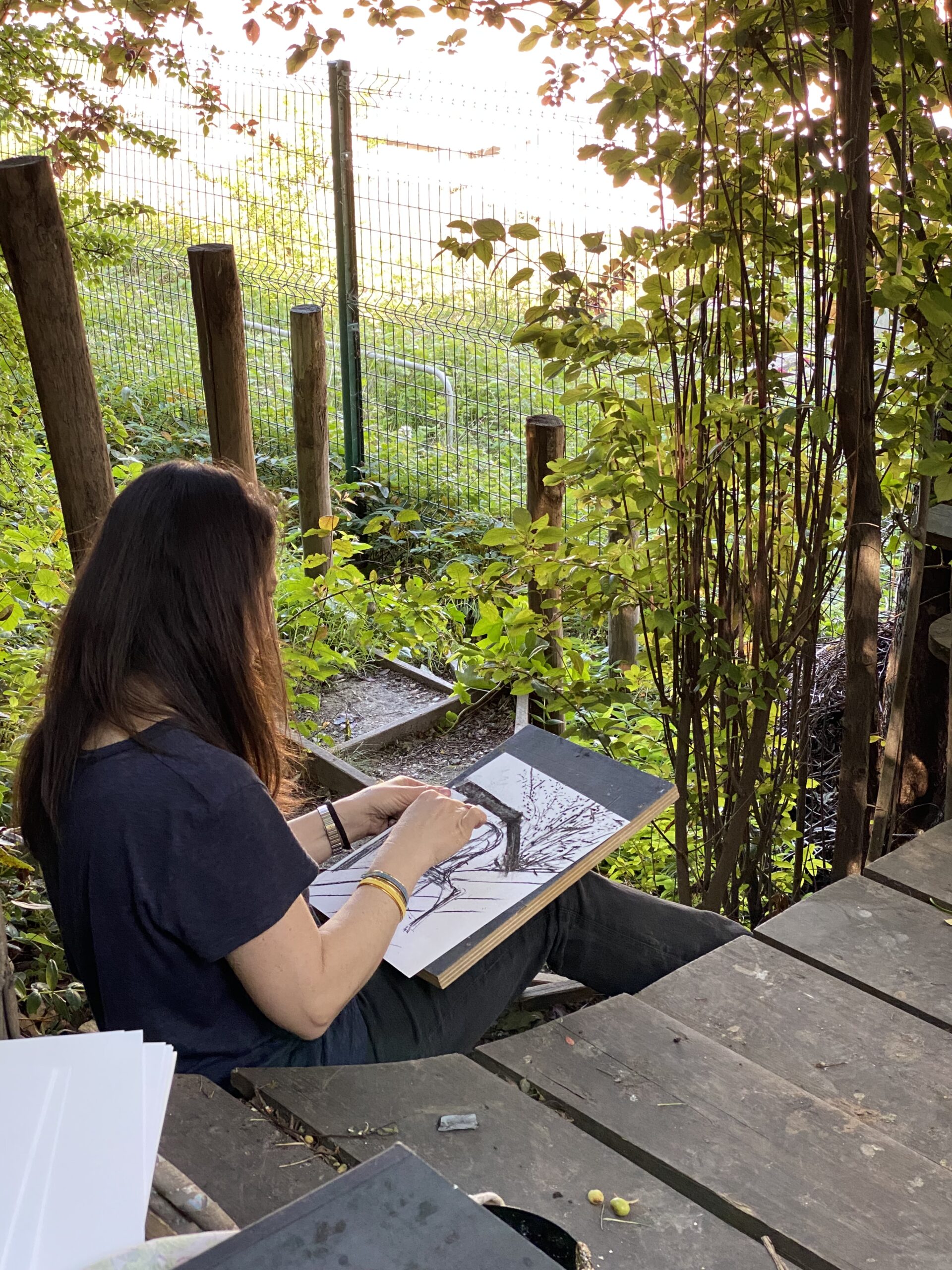 Le fusain donne à voir dans l’instantané du geste la superposition des végétaux, les multitudes de textures, le mouvement de la lumière et des ombres, et permet de capter des moments de vie de la nature du lieu.
