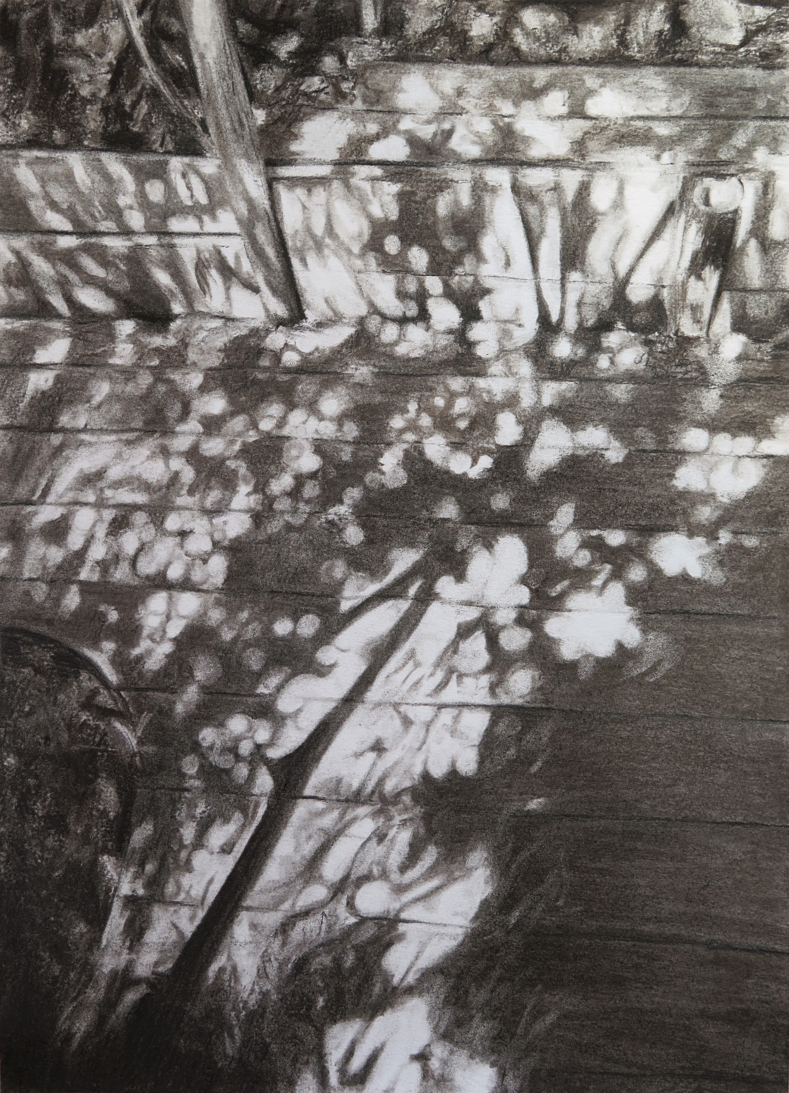 Cette série de dessins a été réalisée aux fusains fabriqués avec du bois récolté dans le jardin du Shakirail, et représente les espaces extérieurs du lieu, qui sont comme un cocon de verdure isolé du tumulte parisien.